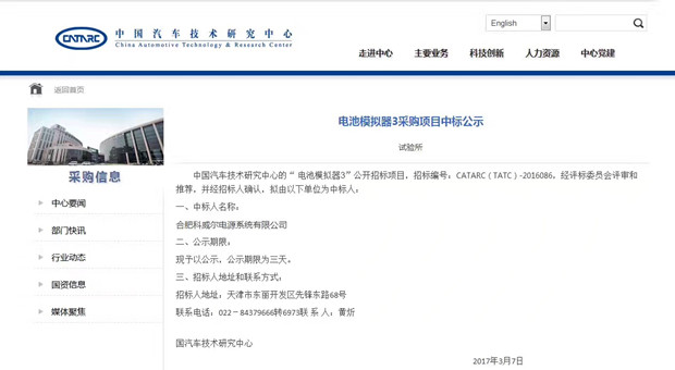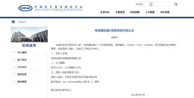 中国汽车技术研究中心2017年3月7日公告,合肥太阳成tyc33455ccwww电源系统有限公司中标中国汽车技术研究中心“电池模拟器2”(招标编号:CATARC(TATC)-2015085)、“电池模拟器3”(招标标号:CATARC(TATC)-2015086)项目。
